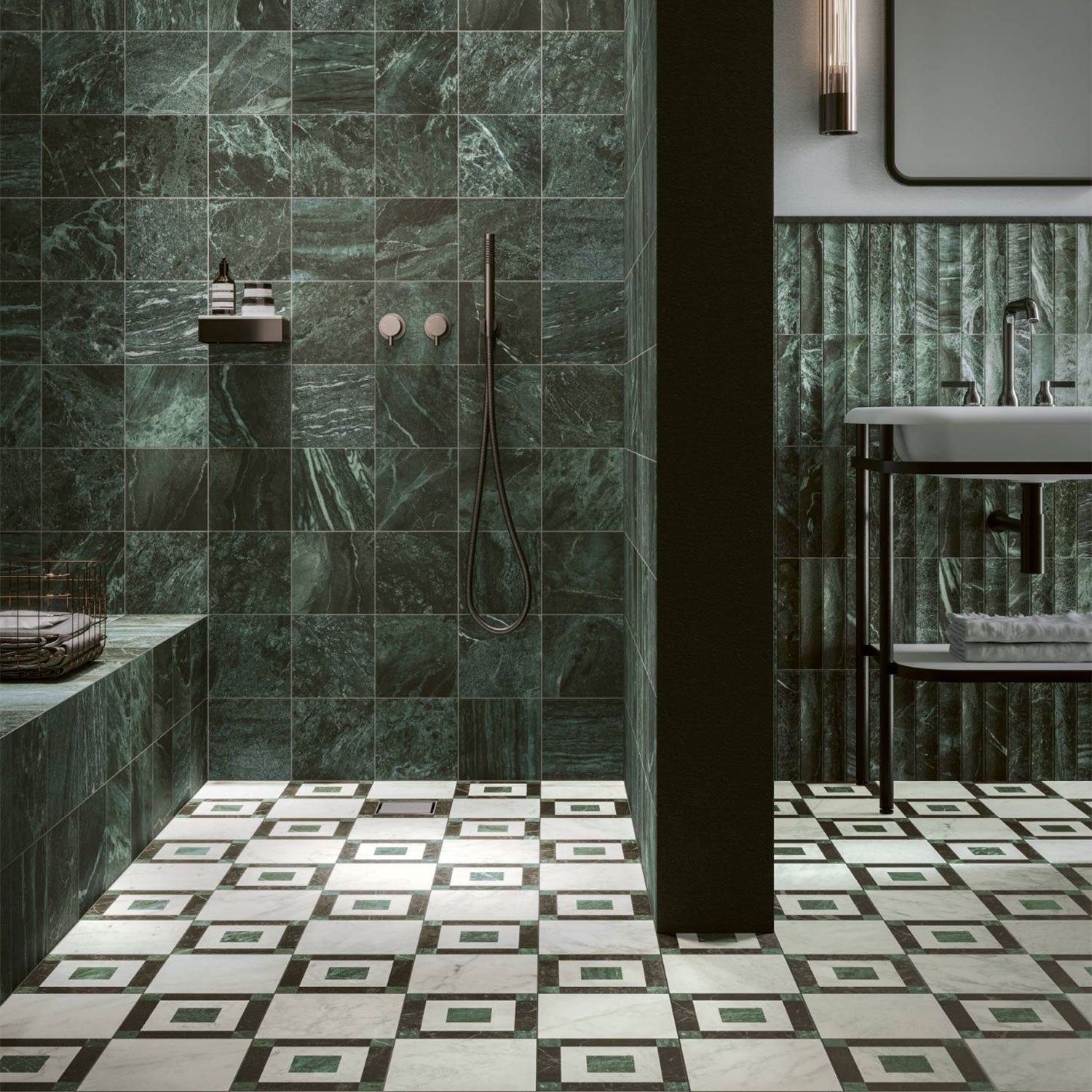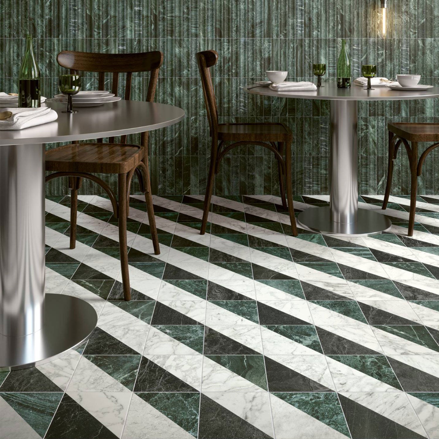 Kette, Band, Nadel, Quadrat, Kamm, Flagge; Intarsien und Muster, die den Hintergrund bereichern, ihn vervollständigen und mit denen ich unzählige Kombinationen kreieren kann. Zusammenfassend: Mr. und Mrs. Keramische Verkleidungen mit akkuraten, klassischen und raffinierten Konturen, ganz wie Manschettenknöpfe am Handgelenk eines maßgeschneiderten Hemdes, die auf unerwartete und doch notwendige Weise perfekt mit dem Rest der Kollektion harmonieren, und ein Augenzwinkern jenen schenken, die sich umdrehen, um hinzusehen.