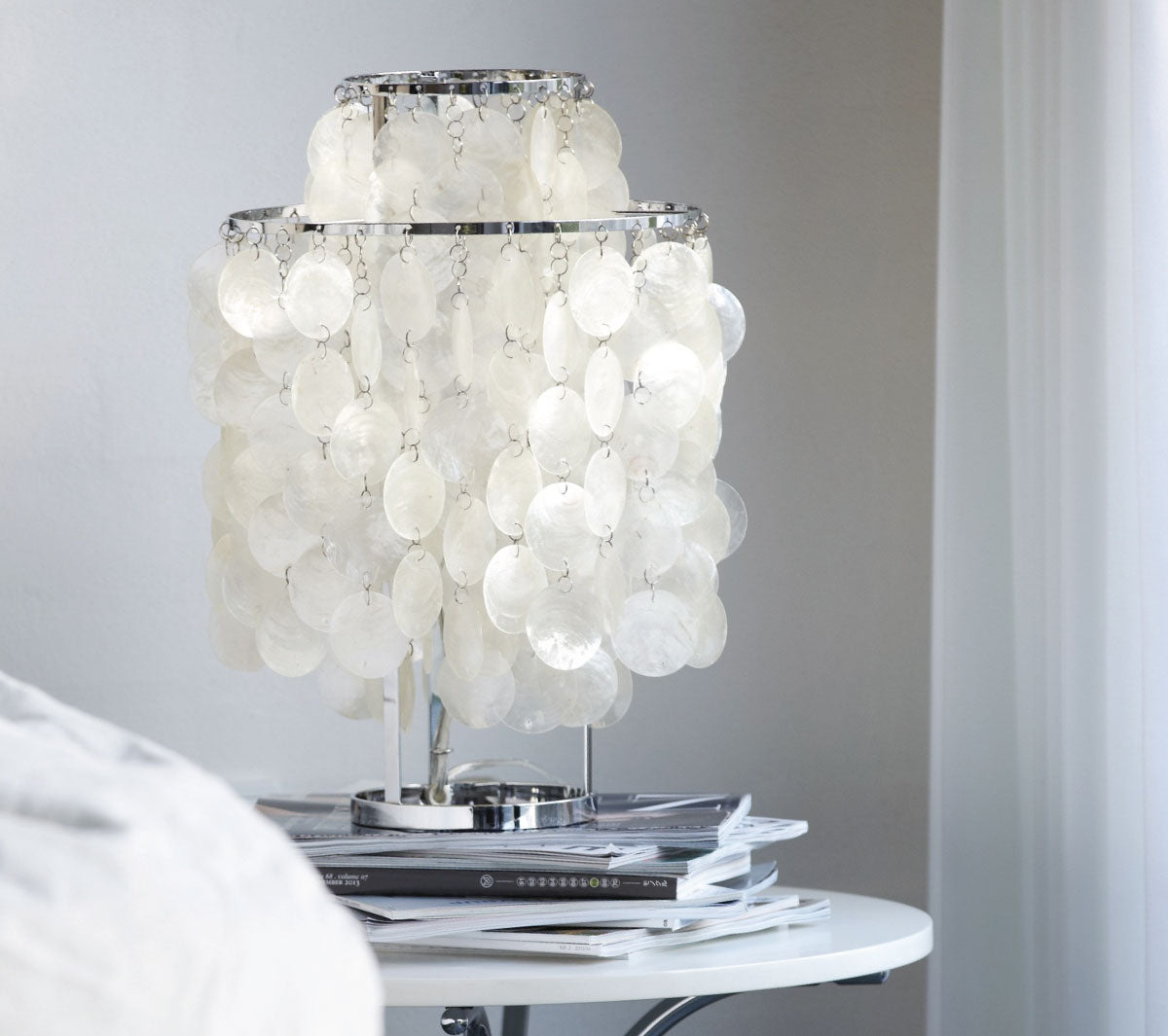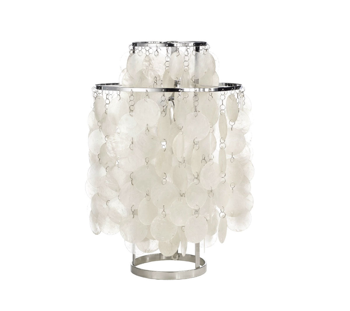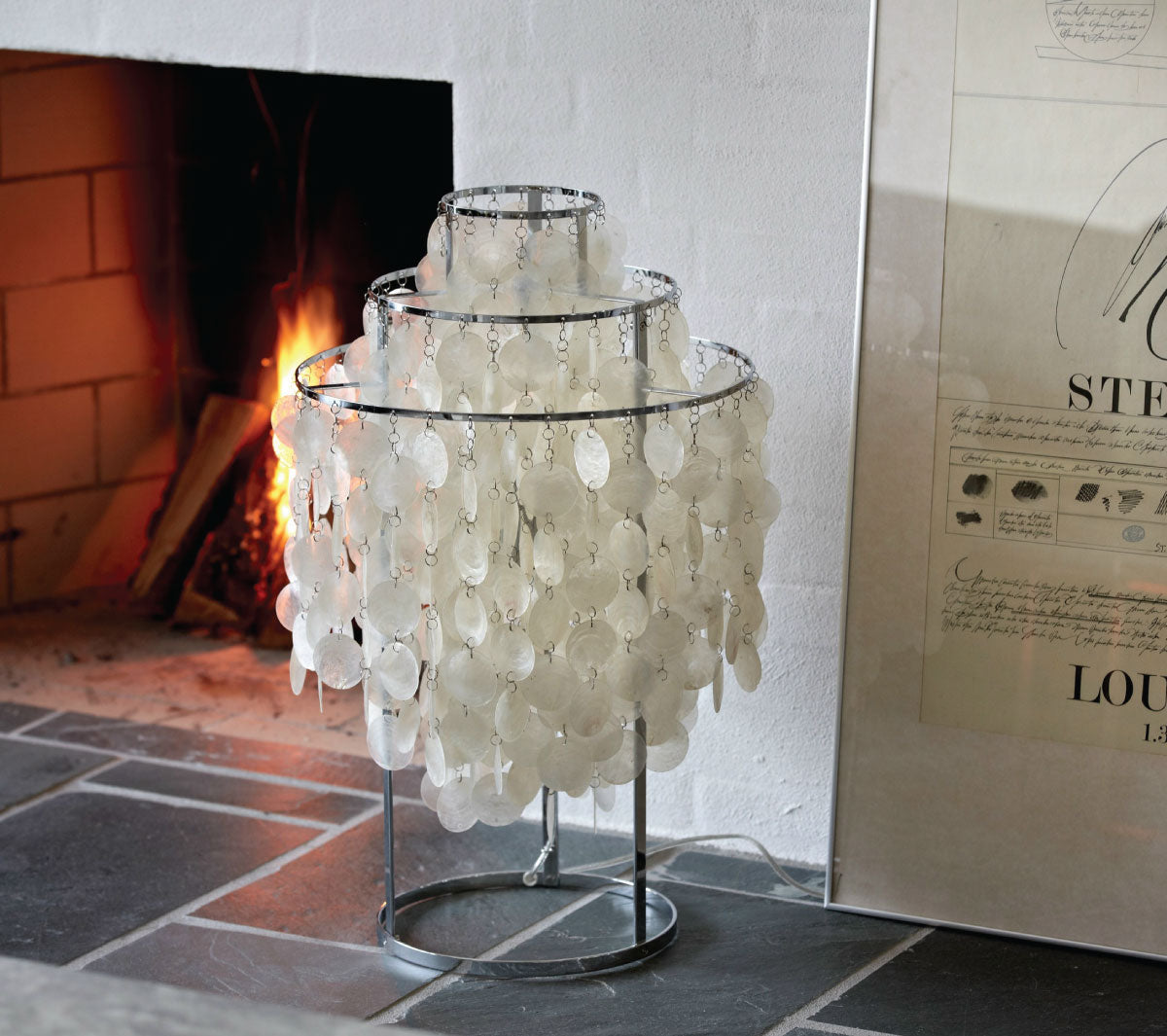 Die Tischleuchte Fun von Verpan ist in den Sechzigern aus einem Entwurf des berühmten Designers Verner Panton entstanden. Die glamouröse Tischleuchte besteht aus vielen zarten Perlmutt Plättchen die durch Ketten miteinander verbunden und an Metallringen aufgehängt sind. Im Gesamtbild wirkt diese Leuchte sehr stilvoll und elegant. Die Leuchte ist in verschiedenen Größen erhältlich und wird mit einem Ein/Aus Schalter geliefert.