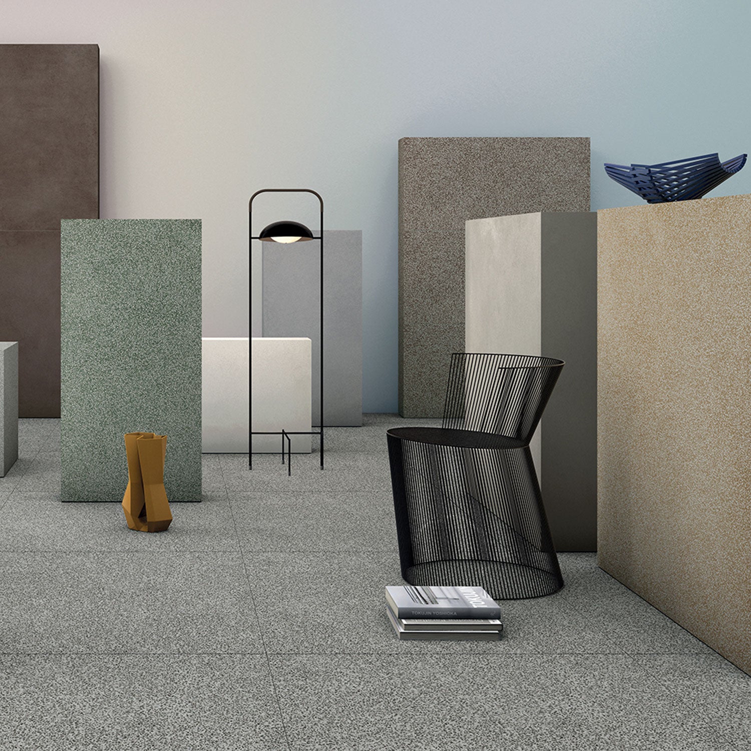 Die Kollektion aus Feinsteinzeug besteht aus 10 Farben. Diese sind in zwei unterschiedliche, künstlich geschaffene Oberfläche untergliedert.