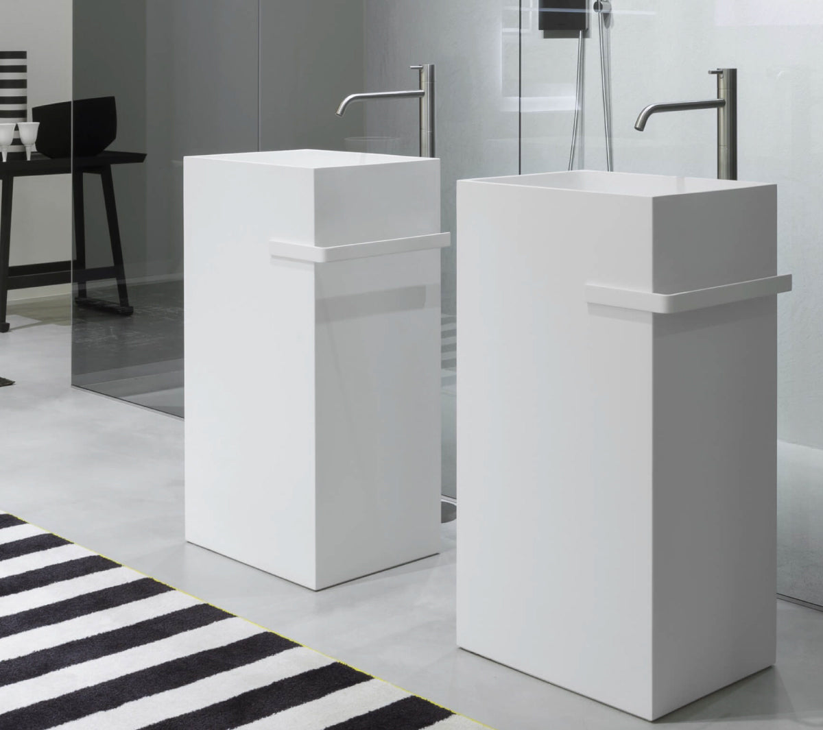 Fusto è il lavabo freestanding realizzato in Flumood dalla geometria rigorosa e dalle linee nette e precise. Una barra porta salviette, corre lungo due lati del lavabo sottolineandone la forma e definendo l’angolo. La sezione piatta trasmette continuità con il resto della composizione. Disponibile nella versione total white o bicolore, con la superficie esterna goffrata disponibile nelle tonalità della gamma antoniolupi o a richiesta su campione del cliente.Scarico a pavimento.